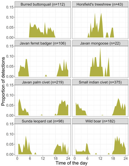 The detection rates of small rodents were spatially correlated to the detection rates of Javan palm civets (r = 0.586) and Javan mongooses (r = 0.617). The detection rates of small Indian civets were temporally correlated to the detection of Javan palm civets (r = 0.770) and small rodents (r = 0.504). There were no other significant spatial or temporal relationships between detection rates. Barred buttonquails, Horsfield’s treeshrews, and Javan mongooses were strictly diurnal, while the other species were detected almost exclusively at night, with just a few detections during the day (Figure 2).