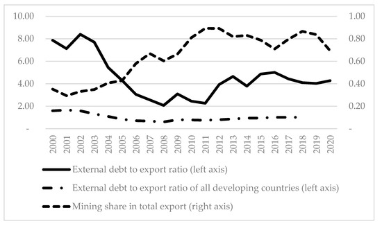 While Mongolia’s mining sector has been experiencing a boom, its external debt has also been increasing substantially over the last decade. In other words, the defining feature of the current state of the Mongolian economy is the recent boom in the mining sector as well as in external indebtedness (Figure 1). Determining the factors responsible for the high growth rate of the country’s external debt is critical for external debt management, because high external debt has a decelerating effect on a country’s economic development, as reported by recent debt–growth nexus literature [1,2,3,4].