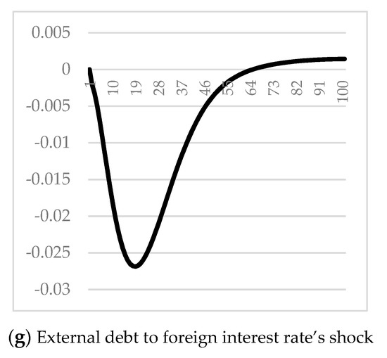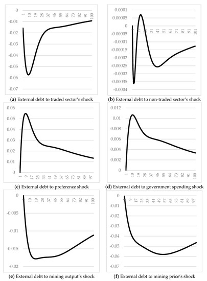 The traded sector’s shock has a decreasing effect on external debt dynamics for the next quarters, while the non-traded sector’s shock has an increasing effect between the next 10 through 21 quarters. The traded sector’s productivity growth increases non-mining exported goods, which earn foreign currency to the country and raise the country’s potential to repay its external debt dominated in foreign currency. Similarly, the non-traded sector’s improvement creates an import substitution effect for the country, but the absolute values of the non-traded sector’s influence on external debt are smaller than those of the traded sector. This result implies that export-oriented development [21], or growth in traded sector’s productivity, is stronger than the import-substitution strategy in terms of the external debt decreasing measure.