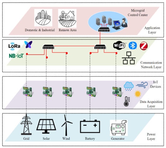 This work focuses on the communication level between the local controller of HRES and the microgrid control center, where the status of different renewable energy sources and loads can be collected and communicated to a central controller that determines an appropriate action in the system. Figure 2 shows the IoT-based architecture for HRES which consists of four main layers: the power layer, the data acquisition layer, the communication network layer, and the application layer [20,21,22,23].