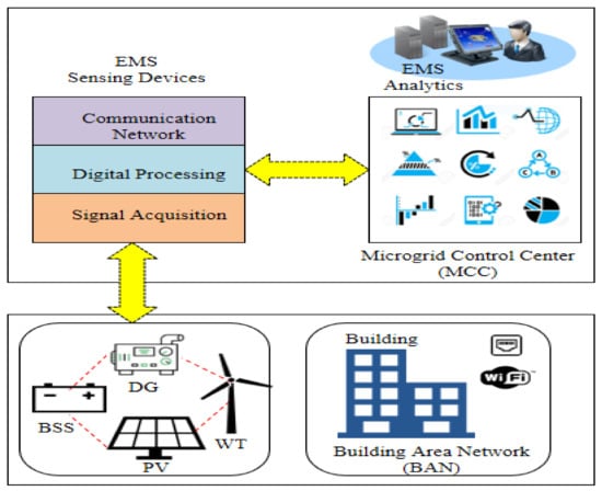 In this work, the main components of HRES are energy sources (PV systems, wind turbines, diesel generators, and electric grids), energy storage system, and load. The selection of HRES elements is based on the scenario of Saudi Arabia because the electricity generation costs for isolated areas, such as mountainous, villages, and desert areas are expensive and face many challenges, such as difficult access to remote sites and low population density. Therefore, hybrid renewable energy generation would benefit such remote areas and reduce dependence on fossil fuels. Different standards have been considered for the information model of the hybrid energy system, such as IEC 61400-25, IEC 61850, and IEC 61850-7-420 [26]. The information model uses the logical node concept to represent the information model for a real device that needs to be exchanged with other devices and/or systems. Figure 3 shows the basic building blocks of the energy management system (EMS) for the hybrid energy system. It consists of two main parts: EMS sensing devices and EMS analytics.