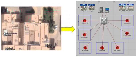Figure 5 shows the detailed communication network configuration of HRES for the smart building scenario. The communication network model is built in OPNET Modeler. The dimensions of the communication network model are 10 m × 10 m. The network configuration includes network setup, configure network traffic, packet size, start time and stop time, source, and destination. The communication network is configured as Ethernet LAN, consisting of 7 subnets: Grid_subnet, Load_subnet, ESS_subnet, Diesel_subnet, Turbine_subnet; PV_subnet; and Met_subnet. All subnets are connected to the building local control center via an Ethernet switch considering a star topology.