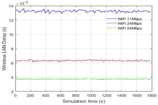 The results of different scenarios configured for Ethernet-based and Wi-Fi-based architectures are given in Table 12 and Table 13. Table 12 shows the simulation results for the end-to-end delay over Ethernet LAN. The results show that the end-to-end delay is about 19.44 ms and 0.19 ms for channel capacity of 100 Mbps and 1000 Mbps, respectively. This indicates that Ethernet-based architecture can support the data transmission for HRES system at the building level. For Wi-Fi-based architecture, the results show that the end-to-end delay is about 3.86 ms and 13.62 ms for a data rate of 54 Mbps and 11 Mbps, respectively, as shown in Figure 6.