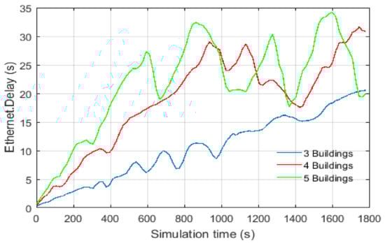 The network topology is configured as a star topology, where the data flow is mainly between individual controllers and the building control center. The impact of the communication technology for Ethernet-based architecture and Wi-Fi architecture is quantified with respect to latency and data rate. First, we validated the simulation models by comparing the amount of received traffic at the server. Each CB-IED transmits the status information to the building control center, where the message size is configured as 16 bytes. The voltage and current measurements are communicating through the MU-IED. The message size is configured as 76,800 bytes. The amount of data received are as follows: 2 bytes/s (temperature), 200 bytes/s (irradiance), 6 bytes/s (wind speed), 6 bytes/s (wind direction), 96 bytes/s (CB-IEDs), and 460,800 bytes/s (MU-IEDs). All data received correctly and consistently with the calculations.