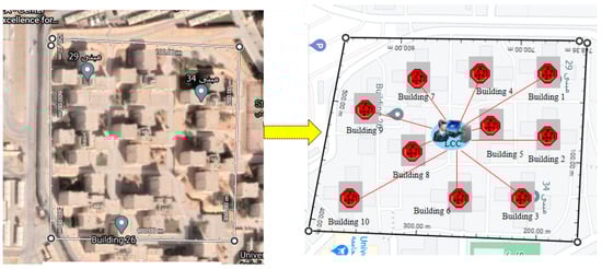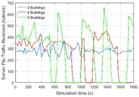 We considered different scenarios for a group of buildings on the university campus. We assumed that each building would be integrated with HRES that can be operated in a standalone mode or grid-connected mode. The dimensions of the network model are set as 100 m × 100 m. Different scenarios have been configured in the simulation with a different number of buildings. The communication network has been configured using Ethernet-based architecture. The configuration of the traffic flow is based on file transfer protocol (FTP). The network models have been validated by comparing the received amount of traffic at the server-side.