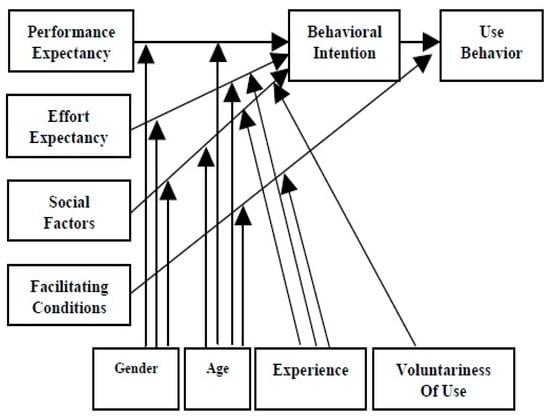 The unified theory of technology acceptance and use of technology (UTAUT) model justifies technology acceptance. It has eight main components. The components comprise the theory of reasoned action (TRA), the technology acceptance model (TAM), the motivational model, the theory of planned behavior (TPB), the combined TAM and TPB, the model of personal computer utilization, innovation diffusion theory and social cognitive theory [34]. Behavioral intention is a predictor that is used in this model. This is the basic form of the unified theory of technology acceptance and use of technology (UTAUT) model: