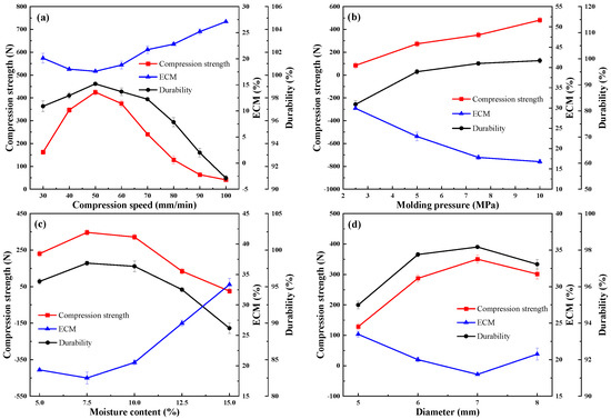 Effect of (a) compression speed, (b) molding pressure, (c) moisture content, and (d) diameteron compressive strength, ECM, and durability.