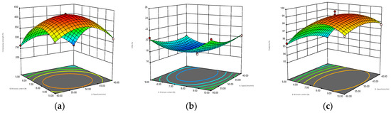 Seventeen experimental runs were carried out as designed by RSM to examine the effects of the three independent variables on the physicochemical properties of RBF pellets. As shown in Table S1, the observed compressive strength, ECM, and durability values were 203.73–427.77 N, 17.05–24.12%, and 93.70–99.58%, respectively. Based on the results of regression analysis (Table 2), the predicted and adjusted R2 of the model for compressive strength, ECM, and durability were 0.9892 and 0.9978, 0.8890 and 0.9609, and 0.8537 and 0.9625, respectively. The difference was less than 0.5, which indicated that the quadratic model was valid, and R2 > 0.90 for all parameters demonstrated significance [28]. Furthermore, the value of adequate precision that ranged from 19.6562 to 72.4015 (greater than 4) is desirable [29]. The values of coefficient variation (CV%) and standard deviation (Sd. Dev.) were lower than 2.15% and 3.89, respectively. This showed that the experimental values were reliable in this regression model [30]. The relationship between the actual and predicted recoveries of all responses is shown in Figure S2, and the results of ANOVA are displayed in Table 3. The p-values from the F-test of the model were less than 0.0001, which indicated that the models were of high significance and the lack of fit was not significant, suggesting that the test error was small and the regression model could better reflect the test results. In addition, the quadratic polynomial equation showing the relationship between the response value and independent experimental parameters in significant terms (terms with p-value ≤ 0.05) of coded factors was presented as below: