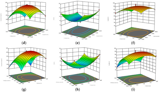 Three-dimensional contour plots for the interaction effects of speed and moisture content (diameter = 7 mm) on (a) compressive strength, (b) ECM, and (c) durability. Interaction effects of speed and diameter (moisture content = 7.5%) on (d) compressfive strength, (e) ECM, and (f) durability. Interaction effects of moisture content and diameter (speed = 50 mm/min) on (g) compressive strength, (h) ECM, and (i) durability.