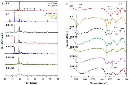 The crystal structures of RB, CF, and RBF-T are shown in Figure 3a. The XRD pattern of RB clearly showed six diffraction peaks from CaCO3 (JCPDS no. 86-0174) at around 23.14°, 29.48°, 36.05°, 39.54°, 43.26°, and 48.64°. At around 26.71°, the peaks of Mg(NO3)2 crystals were displayed (JCPDS no. 19-0765). Meanwhile, the XRD pattern of CF presented three main diffraction peaks of CO(NH2)2 (JCPDS no. 83-1436) at around 22.35°, 24.73°, and 29.44°; KCl (JCPDS no. 41-1476) at around 28.41°, 40.60°, and 66.49°; and (NH4)2HPO4 (JCPDS no. 70-1461) at around 15.94°, 17.60°, and 31.74°. More caudally, the diffraction peaks assigned to CO(NH2)2, (NH4)2HPO4, and KCl were obviously observed in the patterns of RBF-25, RBF-65, and RBF-105, and no new diffraction peaks occurred, indicating that RB was effectively filled by CF while keeping the structure stable. However, the characteristic reflection of CO(NH2)2 gradually decreased with the increase in temperature. Combined with the results of FTIR analysis, this finding may be due to the fact that CO(NH2)2 reacted with the –COOH of RB while filling the porous structure of CO(NH2)2, resulting in the decrease in the crystallinity of CO(NH2)2 [7]. In parallel, after the temperature reached 65 °C, the diffraction peak distributed by KCl was found to be significantly enhanced, indicating that higher temperature is more conducive to KCl crystal. Interestingly, when the temperature reached 145 °C, the peak assigned to CO(NH2)2 almost disappeared and the diffraction peak intensity of (NH4)2HPO4 weakened. Meanwhile, due to oxidation, the peak assigned to CaCO3 and Mg(NO3)2 almost disappeared. These results indicate that the crystal structures of RBF-145 and RBF-185 considerably changed.