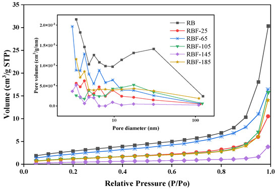 As presented in Figure 4 and Table S2, the N2 adsorption isotherms showed type II characteristic (according to the IUPAC classification), indicating that mesopores and macropores existed in RB and RBF-T [35]. Further, the N2 adsorption capacity of RB was significantly higher than that of RBF-T, and the pore size decreased obviously (especially for macropores), indicating that CF could be inserted into the micropores and mesopores in RB and fill the macropores and exposed cavities of RB. The surface area of RBF-25 decreased by 57% and its pore volume and average pore size decreased by 65.34% and 19.39%, respectively, compared with those of RB as a result of CF covering the surface of RB and filling its macropores. However, the surface area and pore volume of RBF-65 increased by approximately 50% compared with those of RBF-25, and the average pore size continued to decrease, which may be related to the decomposition of CF and the reaction with RB. CO(NH2)2 could be decomposed into NH3 and HNCO. Then, as CF continued to fill in RB and when the mesopores that were originally covered were exposed again, the surface area and pore volume eventually increased to a certain extent. Compared with the surface area of RBF-65, that of RBF-105 decreased and its average pore size reached the maximum due to the number of macrospores that increased. This finding could be attributed to CF beginning to melt and infiltrate into RB at 105 °C. However, due to the low temperature and poor fluidity of molten CF, several mesopores were exposed again and the molten CF crystallized on the surface of the particles, resulting in reduced surface area.