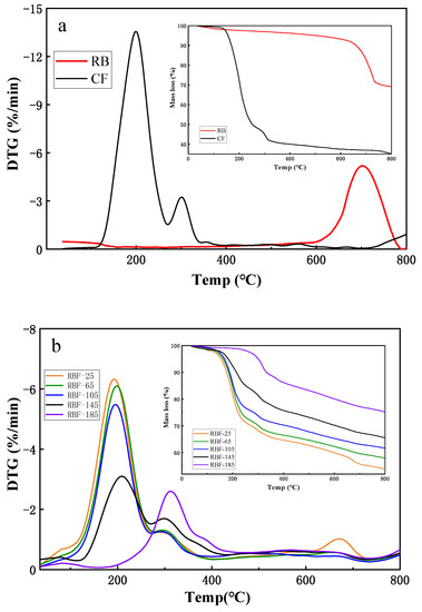 TGA and DTG analysis of CF, RB, and RBF-T shown at images (a,b), respectively.