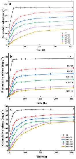 As evident from Figure 6, the release curves of N, P, and K from CF and RBF-T could be divided into two stages: rapid release in the first stage and slow release in the second stage. The release times of N, P, and K in RBF-T was also longer than that in CF. The N release from CF reached equilibrium at approximately 32 h (Figure 6a), with 93.64% release, while RBF-25, RBF-65, RBF-105, RBF-145, and RBF-185 showed 59.12%, 49.41%, 38.44%, 23.90%, and 11.31% release within 32 h, respectively. Afterwards, the cumulative N release of RBF-25, RBF-65, RBF-105, RBF-145, and RBF-185 increased and finally reached 88.68%, 75.35%, 64.89%, 54.39%, and 41.71% after 413 h, respectively. With the increase in drying temperature, the duration of RBF in the first stage notably increased, and the slow-release rate constant (k) in the first stage was significantly higher than that in the second stage (Table 5).
