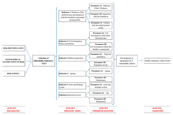 As has been reflected in previous epigraphs, the object of this work is creation of a model that faithfully estimates the vulnerability of buildings built on anthropic landfills. The innovation of this research lies in the simplicity of its application and can be extrapolated to any city in the world. For this, the work has been based on the following phases of study (Figure 1).