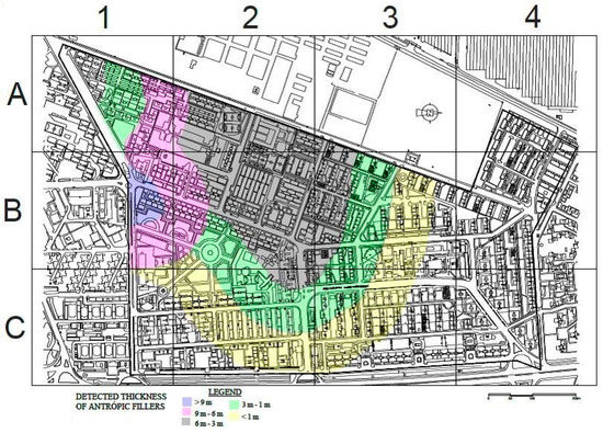 Soil investigation campaigns apply many techniques to identify the limit and extension of these man-made strata. For instance, geophysical testing based on ERT and GPR is successfully used at cultural heritage sites [24]. It is often used geographic information system (GIS) tools and photointerpretation at different scales, and even with unmanned aircraft (drones). This is designed to evaluate surface morphology before carrying out any urban activity that would allow the identification and zoning of areas with recent anthropic fills.