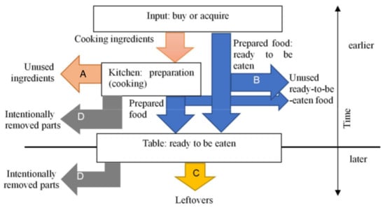 Table 2 shows the definitions of these categories. The items situated between the two thickest lines in Table 2 are the classifications of avoidable food waste that our research group has established. Figure 1 shows how avoidable and non-avoidable food waste are generated during the flow of processes from the input of foods into the household (buying etc.) to eating and disposal.