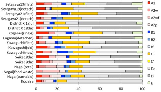 The percentages of total food waste, including non-avoidable, among total waste in our case studies ranged from 21.4% to 50.4% with an average of 35.6%. In fiscal 2020, the Ministry of Environment [16] provided subsidies for sorting analyses on food waste in 18 cities in Japan, and their average was 33.7%, ranging from 23.1% to 46.4%. The percentages of avoidable food waste within total food waste in our cases had a range of 27.5% to 62.5% and an average of 44.0%, while the Ministry of Environment figures were in the range of 18.5% to 53.5% and had an average of 36.2%. Potentially edible preparation residues are excluded in these figures, in our case, category De, and in the Ministry’s case “excessive removal”. The definition of total food waste is more or less the same between us and the Ministry, and there was not much difference in the results. On the other hand, the definition of avoidable food waste is expressed somewhat differently, and our results appear to be slightly higher. Our case studies have a wider range, as they show results of different housing types separately. In the ministry’s cases, the figures represent each city with a mixture of housing types. Further discussion on the results is shown in Appendix B.