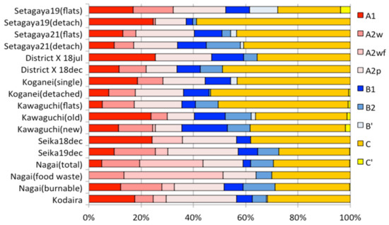 From the results of the sorting analyses, we tried to identify the differences in trends between urban and rural areas. However, regardless of regional characteristics, no major tendencies were identified in terms of the composition of food waste, assumedly because the lifestyles of Japanese people are basically similar throughout the country; whether in urban or rural areas, people basically go to the supermarket to buy food and prepare dishes at home. However, Setagaya and District X in the central part of Tokyo tended to have less of category A than in the rural areas (Seika Town and Nagai City). It is possible that residents in rural areas tend to prepare meals with raw ingredients while urban dwellers tend to rely more on processed food items, and the waste composition reflected this tendency. In the future, more survey results should be accumulated to verify this trend.