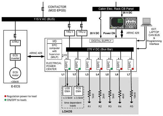 EPC is an Electrical Power Center for aeronautical applications, which deals with the power regulation of the connected loads; it is equipped with solid-state power controllers (SSPC), which communicate via a Controller Area Network (CAN or CAN Bus) type 2.0B with a supervisor, where the energy management logic is executed [3]. The control is able to disconnect or reduce the power to non-essential loads automatically, to prevent the main generator from being overloaded [21].