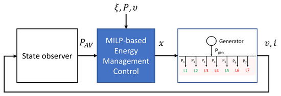 In this section, the problem is formulated as Mixed integer Linear Programming (MILP); the core of the control scheme is reported in Figure 2. For our discussion, we consider the plant status as fully observable, thus allowing the calculation, for each time-step, of the available power . The MILP based power management control has additional inputs, which are the load priorities, their power size and the vector , having the elements set to 1, in correspondence with the loads that can be reduced in power, or to 0 for ON/OFF loads.