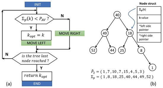 Despite the new solution, this still does not ensure that the tree is fully balanced, i.e., the left path has the same depth as the right path, and its structure is close to that of Figure 3b. The algorithm explores the tree until the cumulative power is greater than the available power . As an example, we can refer to the to the algorithm of Figure 4a by assuming the tree nodes having as structure the left and right pointer, the cumulative sum value and the k index. The search time depends on the number of nodes that must be considered to find the optimal solution and finally depends on the tree balancing level.