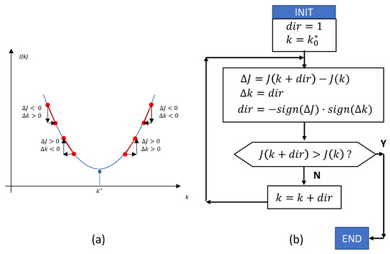 If , the gradient method approach is adopted to find the solution. The algorithm searches the point that minimizes (8) and, thanks to the two corollaries previously reported, the local study of the function allows us to fully understand the side of the minimum with respect to the test point. To better understand this process, we can refer to the Figure 5, where the sign of the J variation is reported by changing the k index in both directions. By assuming as positive the direction associated with the k increasing and as negative the opposite one, starting from a generic point of the curve, the direction for the minimization of the function is given by the following relationship: