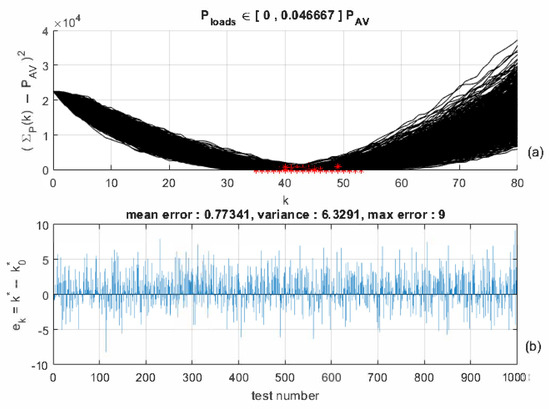 If the load’s nominal power is relatively great compared to the available power, the solution is found in a few steps. For our study, then, we have to consider the worst case, i.e., several loads, with each one having small nominal power compared with . In order to better understand this point, we first assume small loads having power in the range . Due to the unpredictable knowledge of the distribution of the power set, the Monte Carlo numerical approach is adopted to perform a statistical analysis. Figure 6 reports the stochastic test, repeated with 1000 different sets of vectors P, each one randomly generated. The function defined in (8) is shown in the Figure 6a subplot with the corresponding minimum point marked in red. The second subplot of the same figure reports the prediction error, calculated as: ; the x-axis values are the corresponding error test numbers.