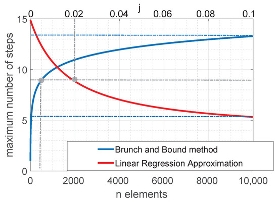 Figure 8 reports in detail the comparison between the two methods. The graph is useful to select the best algorithm for the application by considering the worst case. Starting from the problem size n, the blue line gives the maximum number of steps needed to reach the problem solution. If we draw a horizontal line passing for this point, we obtain an intersection with the red line. The corresponding point gives the maximum allowable granularity j associated with the same maximum number of steps. If the problem under study has better granularity, the LRA method wins over the branch-and-bound method. As an example, if 10,000, the LRA method wins for . The LRA always wins in the case of as its trend does not depend on the problem dimension, thus becoming simply a function of the granularity of the loads.