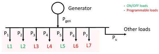 Let us assume n as the number of loads under the control of the Supervisor, each one defined by the priority number positive integers, and positive real numbers as the nominal power of each corresponding load. The Supervisor defines the load connections by avoiding the generator overload. In other terms, the Supervisor must guarantee that , with the maximum available power assigned to the loads, calculated as (1), which is the difference between the nominal power and the power absorbed by loads that are not under control.