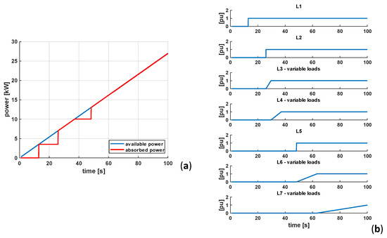 With the new definition of the load power, the Supervisor allows the loads L1 and L2 to be connected, but this matter does not automatically imply that L1 or L2 are effectively absorbing power. For the algorithm test, it must be verified first that the absorbed power never exceeds the limits, which are now a function of the time-dependent load power. As can be observed, the absorbed power (red line) in Figure 11a is always less than or equal to the available power (blue line), so that the power limits are always respected. As regards the activation sequence, the available power is always greater than zero, thus allowing the first six loads to be always connected, as shown in Figure 11b. Only the low-priority load L7 has been used to avoid power overload by reducing its absorbed power.