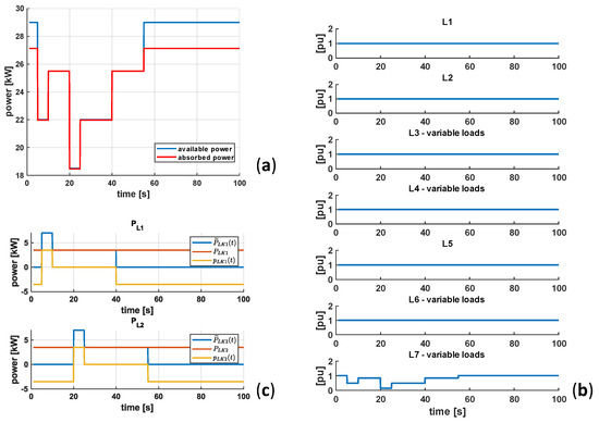 Test case for different available power and derating loads, with L1 and L2 changing with steps. (a) Available power compared with absorbed power, (b) p.u. setting for loads depending on properties: fixed loads and variable loads, (c) L1 and L2 power.