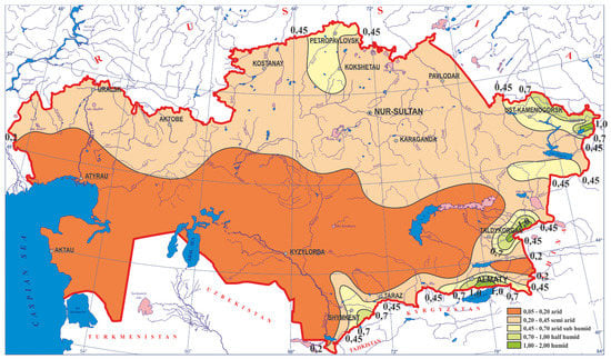 As a result of climate change and human activities, central Asia is experiencing an increasingly severe deficit of water resources with increasing temperature and variable precipitation pattern []. Lands of Kazakhstan are featuring a variety of soils: a large part of the forest-steppe zone is occupied by chernozem (black earth), dark brown, light brown, and brown soils can be found to the south of this area. Desert and semidesert soils are represented in the form of sierozem (gray-brownish soil).