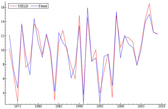 Our results reflect the most recent discoveries in the climatic drivers for crop yields. We have identified several effects to be significant in the model of wheat yield in Kazakhstan; most importantly, the connection between El Niño and wheat yield, the role of changes in cosmic radiation, solar activity, and soil moisture, resulting from precipitation and temperature dynamics. Our paper has confirmed a link between cosmic rays, solar activity, and wheat yield, which are rarely studied together with traditional climatic variables such as precipitation and temperatures. The model could be modified further so that the individual components could be forecasted into the future using various forms of a time series ARIMA model. The resulting integration of these forecasts allows the prediction of wheat yields into the future (Figure 6).