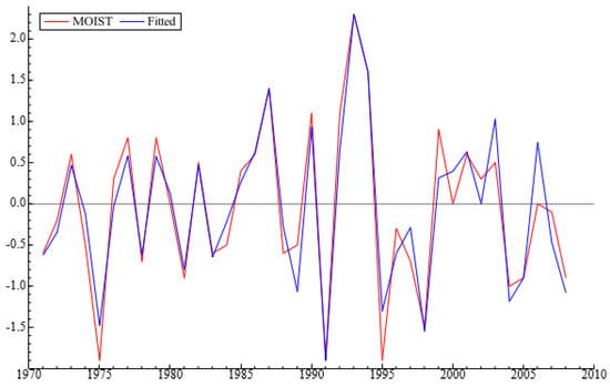 Econometric model of soil moisture dynamics in the Kostanay region, Kazakhstan. The estimation sample is: 1971–2008. Red line—original soil moisture data. Blue line—modelled data. Source: author calculations.