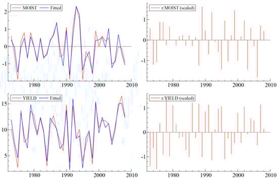 At the same time, we modeled soil moisture separately in an additional equation based on the connections with precipitation and temperatures. Figure 4 presents the performance of our model for soil moisture. It is interesting to note the years that came up as significant outliers in the model equation: 1987, 1991, 1993, 1994, and 2005. During the years of 1987 and 1991 moderate El Niño events were observed; 1994 and 2005 were the years of weak El Niño.