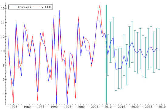 The visual observation of the moisture and yield curves in Figure 5 points to the fact that the model covering the 36 observations between 1973 and 2008 fits the data well. The explanatory model has been transformed into a forecasting model via ARIMA time series modelling and final integration. The resulting model is capable of forecasting fluctuations in yields up to the year 2030. As Figure 6 illustrates, we should have expected a drop in yields in 2013 to a level of just above 7 t/ha and should expect gradual increases to a maximum yield level of approximately 11 t/ha in 2019, after which the yields continue fluctuating at around 10 t/ha.