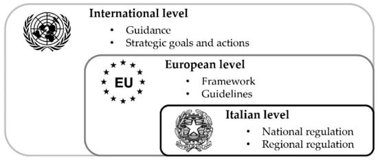 The main regulatory frameworks regarding GPP and waste management are hereafter investigated as the foundation of the proposed methodology. This section aims to analyze the topics describing global goals and directions while presenting the Italian position on the issues. In addition, soil protection and brownfield regulations are briefly analyzed since the case study is a brownfield revamp for new construction. The analyses are performed at the (Figure 1):