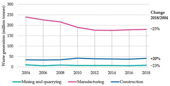 Comparison of current waste generate trends in the construction, mining and quarrying and manufacturing sectors, excluding major mineral wastes, EU-28, 2004–2018. Data source: EUROSTAT 2019 (env_wasgen).