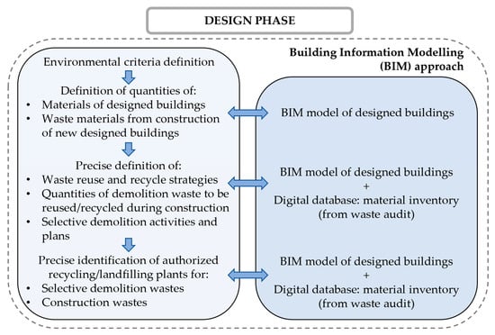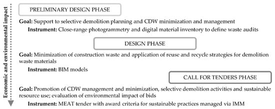 Consequently, the presented methodology proposes the adoption of IMM approaches by using a digital database to manage CDW and for the proper planning of selective demolition activities. The creation of a BIM model, on the other hand, is proposed for the design phase, supporting sustainable resource use and waste minimization strategies. Concerning the call for tenders phase, the methodology proposes a framework for the introduction of award criteria regarding sustainability aspects in the tender documents, and for the evaluation of the environmental impact of the bids (Figure 3).