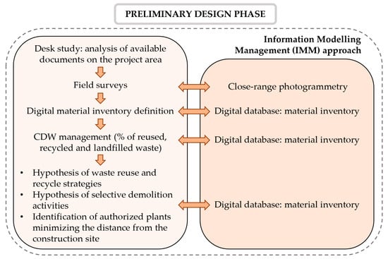 During the preliminary design phase, the methodology proposes the creation of a digital material inventory, i.e. a digital database, for waste audits to plan and manage CDW streams and the selective demolition activities of existing facilities. A general scheme of the methodology is presented in Figure 4.