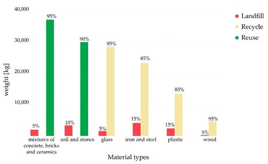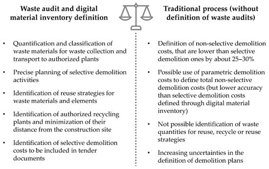 In the European framework, attention to both the design phase supporting the EPR approach and the conscious choices of materials, i.e., recyclable, recycled, durable, non-hazardous, and local materials and products, and the concept of waste as a resource, is stressed [23,24]. The definition of selective demolition is also proposed, highlighting the need to integrate it in standard design procedures [23]. Furthermore, in 2018, the EU Commission released guidelines for the definition of waste audits: they have a central role to ensure the proper identification and separation of demolition materials, thus facilitating the application of selective demolition and reusing and recycling practices [5]. Waste audits exploit their major potential if performed during the design phase since they enable a detailed estimation of the costs of the selective demolition, separation, recycling, recovery, and landfilling of materials. Consequently, a correct estimation of costs can be encompassed in the total budget for the call for tenders, supporting a successful accomplishment of the process [25].