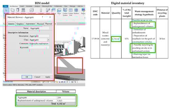 Data collected through field surveys are the basis for the definition of the digital material inventory, i.e. the output of the waste audit. The digital material inventory allows the organization and management of a higher quantity of data by going beyond the basic level of information of a standard inventory of materials [5]. The proposed digital material inventory structure is shown in Table 2, and includes: