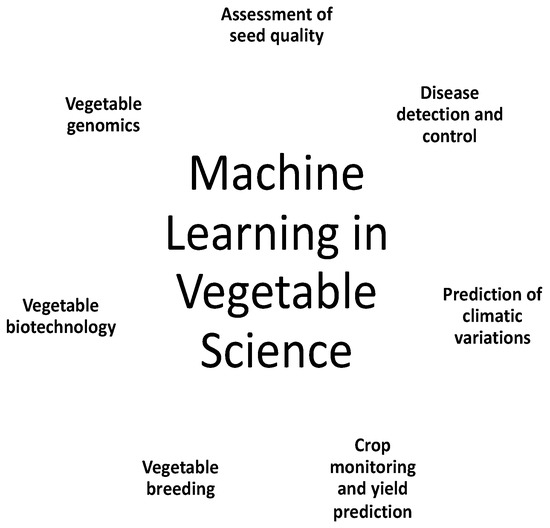 The results of both traditional and in vitro plant breeding studies were analyzed and interpreted using traditional statistical techniques [23,24]. Variance and linear regression models were mainly used in these analytical techniques to assess variable relationships and predict independent variables’ effects on dependent variables, according to multiple linear relationships. Plant biological systems, on the other hand, are inextricably linked to nonlinear and non-deterministic properties [25]. The majority of plant breeding methods are based on “multiple-independent variables versus multiple-dependent variables”, necessitating the use of a single regression model for each output [26]. ML, which is the science of programming computers to analyze data, has been widely used to decipher the relationship between DNA sequences and observed phenotypes in both conventional and in vitro plant breeding research [27,28]. For example, artificial neural networks (ANNs), random forest (RF), and support vector machines (SVMs) are nonlinear nonparametric ML algorithms commonly used in plant studies [29,30,31] which can par and interpret non-normal, nonlinear, and nondeterministic unpredictable data sets. Moreover, ML models can also be used to identify and classify transposable elements using data from genome sequencing [32,33,34]. Although there are several tasks managed by the application of machine learning to vegetable science, the scope is unlimited (Figure 1). This review will discuss the application and advances in several important ML approaches to the different sections of vegetable science.