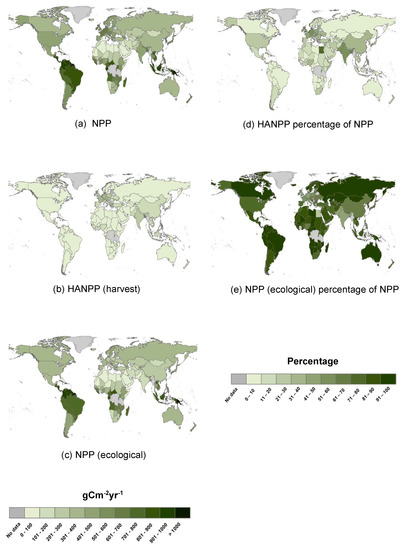 Authors at the Institute of Social Ecology in Vienna (e.g., [12]) provide a solid basis for comparing HANPP among the world’s countries around the year 2000. By country, NPP varies from 10 gCm−2yr−1 in Western Sahara, to 1144 gCm−2yr−1 in French Guiana (Figure 2a). HANPP (harvest) varies from 0.1 gCm−2yr−1 in Western Sahara to 518 gCm−2yr−1 in the fertile multi-cropped fields of Bangladesh (Figure 2b). NPP (ecological) varies from about 10 gCm−2yr−1 in Egypt and Western Sahara, to over 1100 gCm−2yr−1 in Guyana, French Guyana and Suriname (Figure 2c). The percentage of NPP that is appropriated ranges from less than one percent in these three small Latin American countries, to 60% in Bangladesh, and 76% in Egypt (Figure 2d), where most NPP is induced in irrigated crop fields. Conversely, the percentage of NPP (ecological) ranges from 23% in Egypt and 30% in Bangladesh to over 99% in the Guianas (Figure 2e).