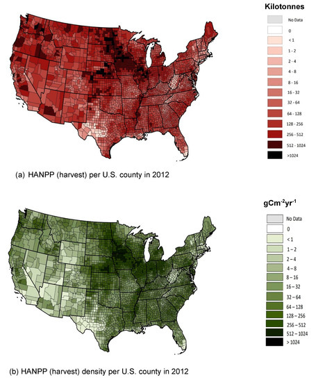 (a) HANPP (harvest) per U.S. county in 2012 (kilotonnes). (b) HANPP (harvest) density per U.S. county in 2012 (gCm2yr−1).