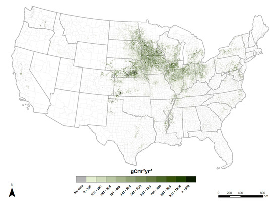 The USDA-NASS Cropland Data Layer (2021) provides a means to apply big data techniques to study HANPP at a pixel scale. By combining these data with annual mean yield data for counties from USDA Quick Stats (2018) [28], a pixel-level measurement of HANPP (harvest) can be derived, such as for corn grain (Figure 4). Applying these data for all crops grown in a specific county and assigning HANPP estimates through livestock grazing to pixels in the grassland/pasture category allows for a pixel-level analysis of HANPP (harvest) for a U.S. county, such as the Corn belt county of Lyons county, Iowa.