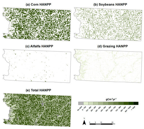 HANPP (harvest) density (gCm2yr−1) for Lyon County, Iowa in 2012 for (a) corn grain, (b) soybeans, (c) alfalfa, (d) livestock grazing and (e) total HANPP (harvest).