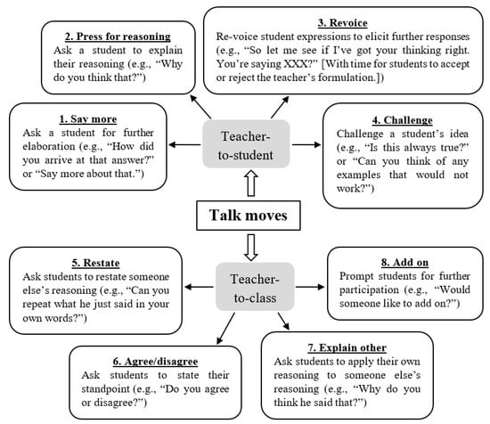 Michaels et al. [23] and Resnick et al. [24] established a framework of productive talk for classroom teaching based on their 15 years of experience working with frontline teachers. They proposed a system of academically productive talk moves to elicit student responses. These talk moves can be classified into teacher-to-student and teacher-to-class productive talk moves, as presented in Figure 1. Teacher-to-student talk moves involve dialog between the teacher and student. For example, in “press for reasoning” Garcia-Mila et al. [25] encouraged their teacher participants to scaffold a student to further explain his/her answer. In teacher-to-class talk moves, the teacher would involve other students in the dialog, prompting them to explain the student’s ideas and reasoning. The teacher can thus identify the students’ correctness or correct any mistakes in their responses [26].