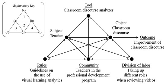 A distinctive feature of the professional development program was the use of visual learning analytics. The design of the program was grounded in activity theory and established a holistic activity system [14] to facilitate improving teacher discourse and expand the use of technology in the classroom [13]. From the reflections and interview data, the major themes we identified are situated in Vygotsky’s mediated-action model (Triangle 1 of Figure 2), where a human agent pursuing an object is mediated by tools [14,33]. In our program, the process by which participants sought instructional improvement was mediated by the visual learning analytics technology. The findings suggest that the visualization of classroom video data can increase the teachers’ understanding of their reflections on their classroom instruction and lead to instructional change.