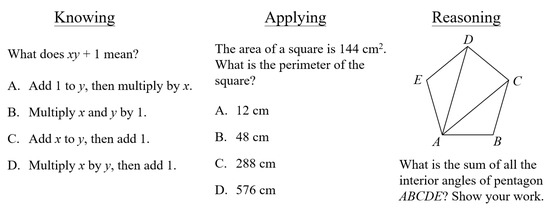Tests were used to evaluate the students’ mathematics achievement. Before the start of the program, a pre-test assessed the students’ initial equivalence in the treatment and comparison groups. A post-test compared their mathematics achievement at the end of the program. The pre- and post-test lasted for 40 min each and were similar in scope and level of difficulty. To ensure validity and reliability, the design of the test papers was based on Trends in International Mathematics and Science Study (TIMSS) and were graded by experienced mathematics teachers. The total score of each test was 47 and covered three cognitive domains: knowing, applying, and reasoning. As Mullis and Martin [38] explained, these three domains basically cover the appropriate range of cognitive skills across the content domains of mathematics, such as algebra and geometry. Figure 3 shows a sample question, as adopted from TIMSS [39], in each of the three domains. The procedure of data analysis followed guidelines by López et al. [40]. According to the Kolmogorov–Smirnov test, there was a significant deviation from normality of the two research groups in the pre- and post-test scores. Therefore, a non-parametric test, the Mann–Whitney U test, was run to analyze the student test data [41]. Specifically, the overall scores as well as the scores in each cognitive domain were compared between the treatment and comparison groups.